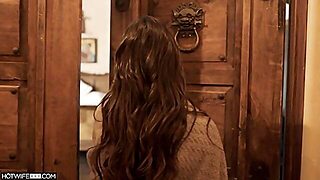 Bitchy brunette Michelle Lay likes jumping on a large sausage